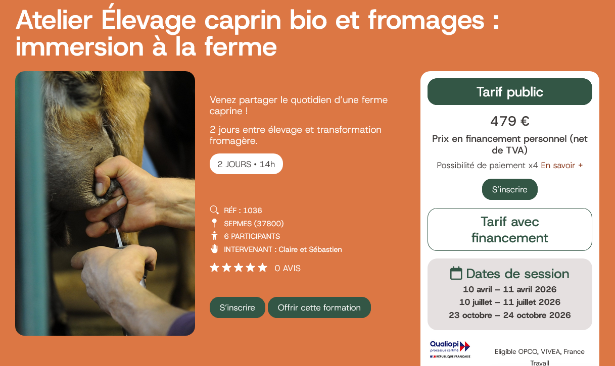 Guidé par Sébastien et Claire, producteurs passionnés et engagés dans une démarche biologique et locale depuis plus de 15 ans et pédagogues passionnés, vous apprendrez à nourrir et soigner un troupeau de chèvres, à transformer le lait en fromages.